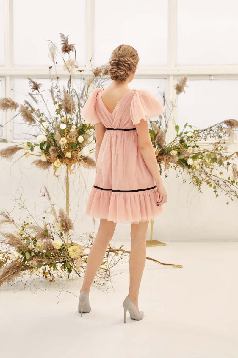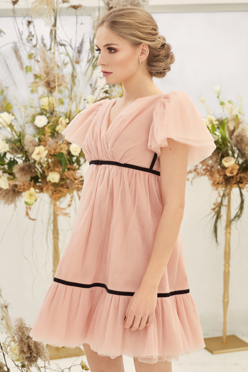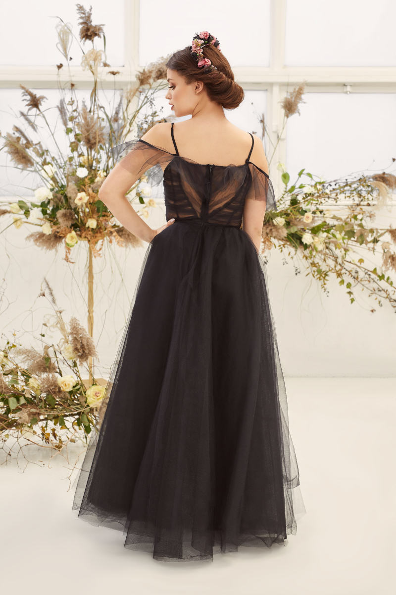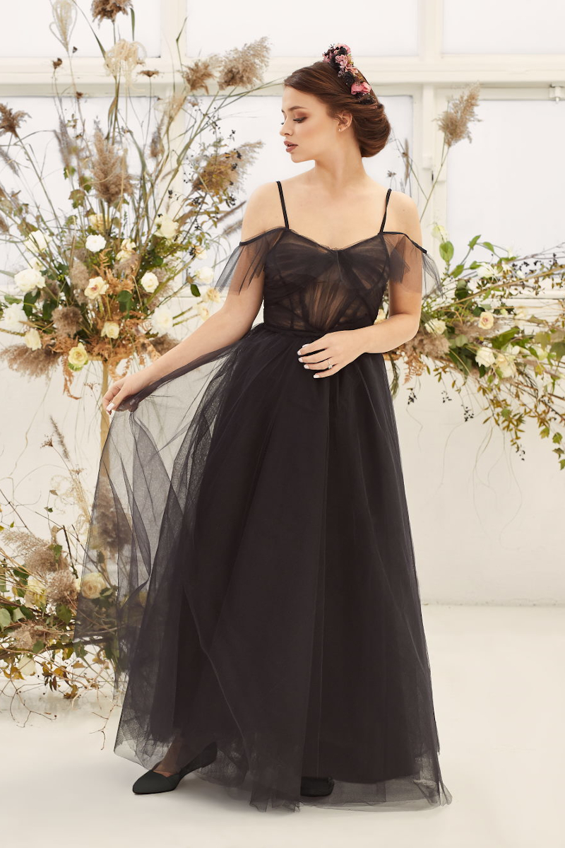 Bardzo lekka sukienka z wielu warstw tiulu, udekorowana czarnymi, aksamitnymi tasiemkami. Marszczenia dodają dziewczęcego charakteru.