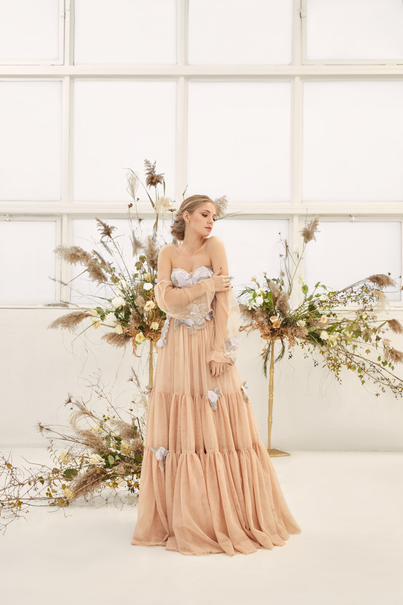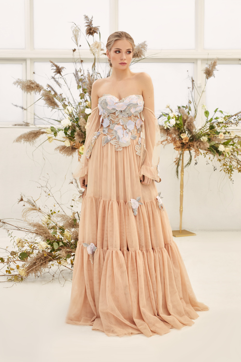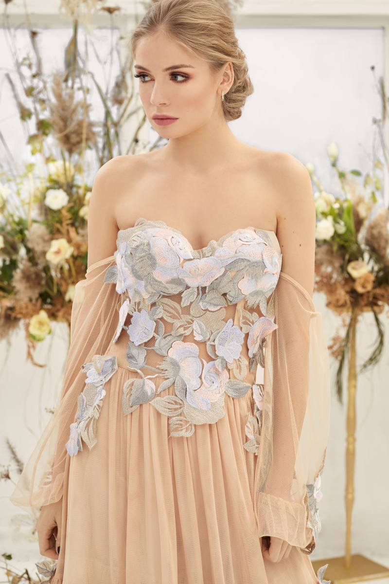 Prześwitujący, cielisty gorset wykonany z siateczki ozdobiony misternie wyszywaną koronką z motywem listków i kwiatów. Dół tworzy wiele warstw tiulu uniesionych na delikatnej halce. Kreację dopełniają koronkowe, subtelnie opadające rękawki w stylu hiszpańskim.