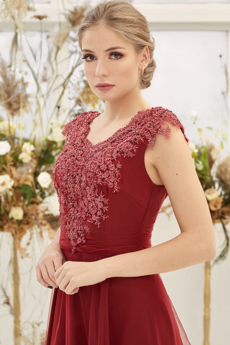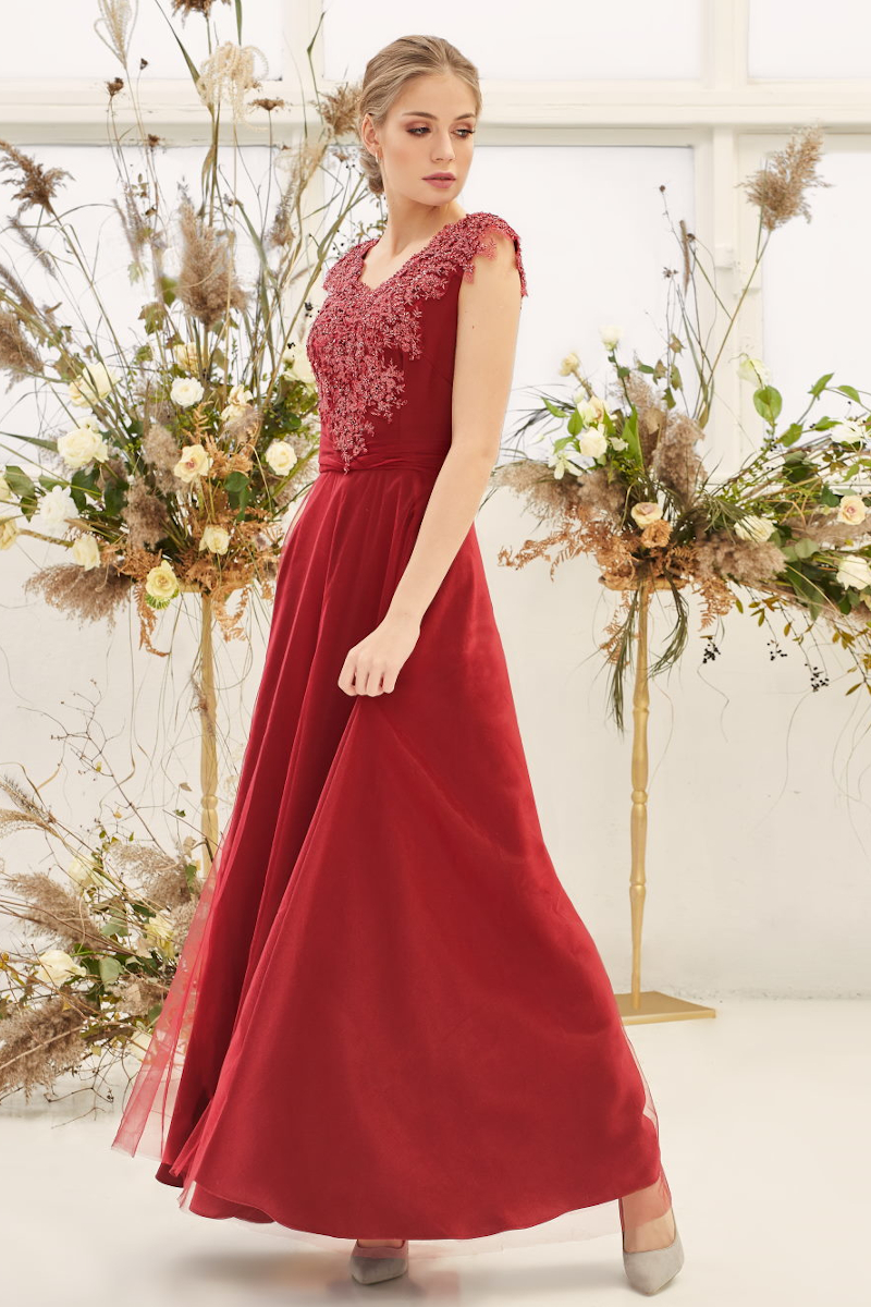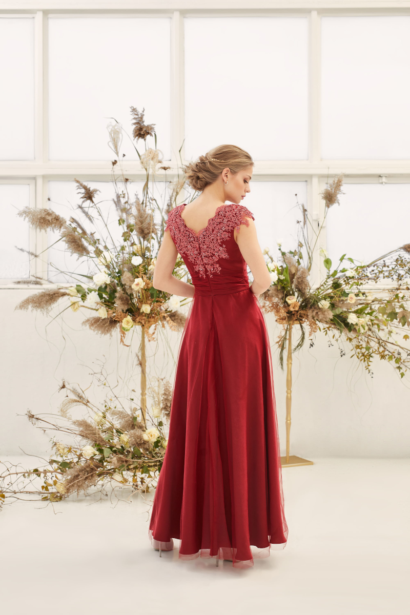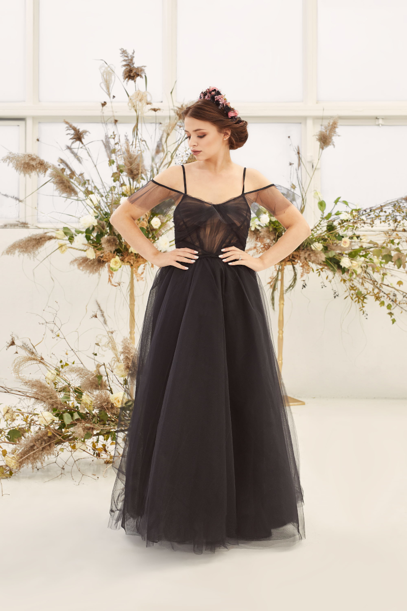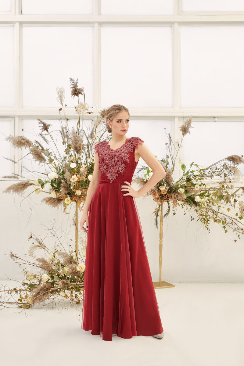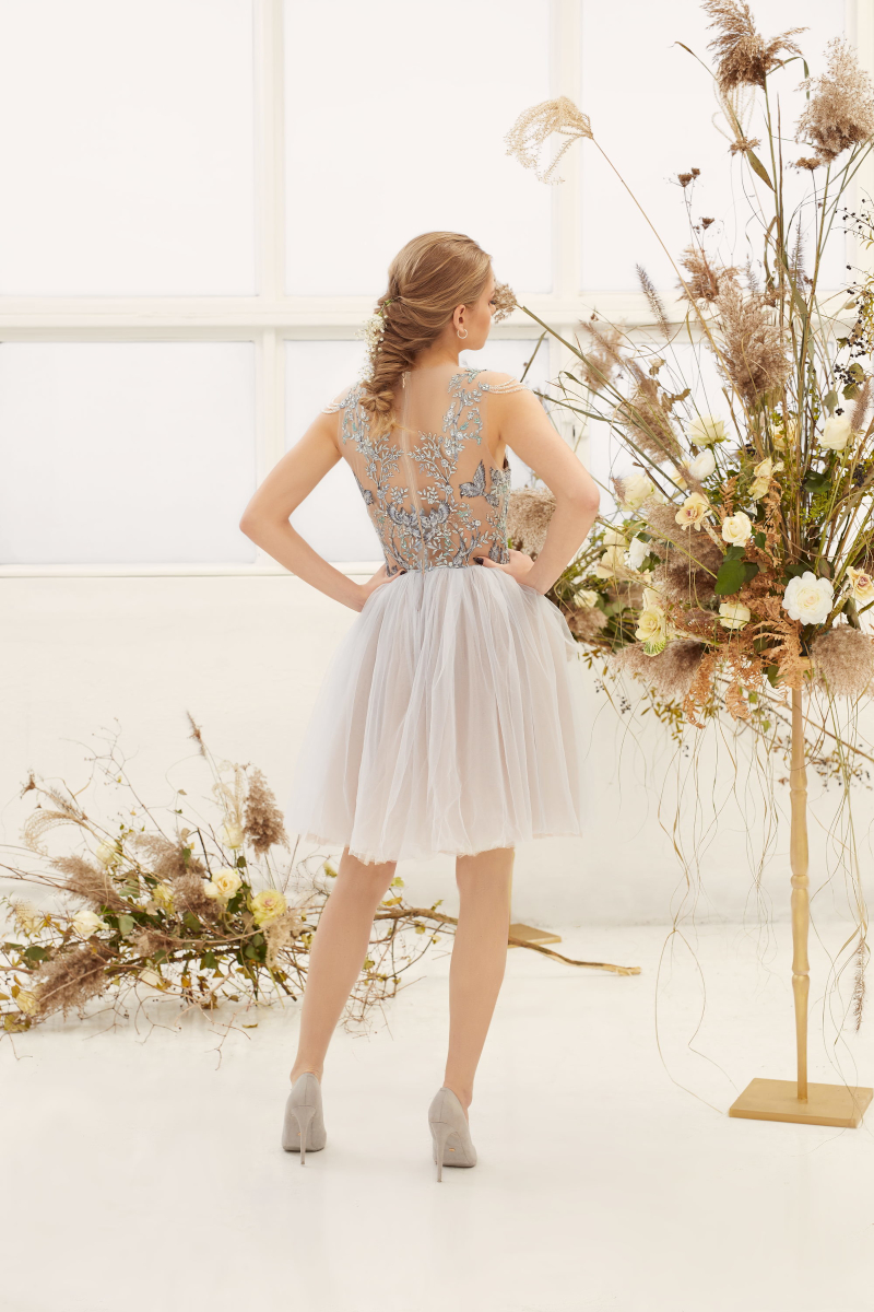 Suknia wieczorowa z bogato zdobionym dekoltem. Połyskująca koronka z naszytym ręcznie motywem kwiatowym stanowi dominujący element kreacji. Specjalne drapowanie tiulu podkreśla talię. Wierzchnia warstwa sukni również wykonana z tiulu.