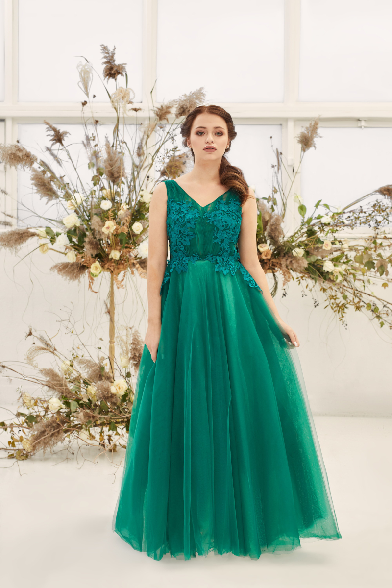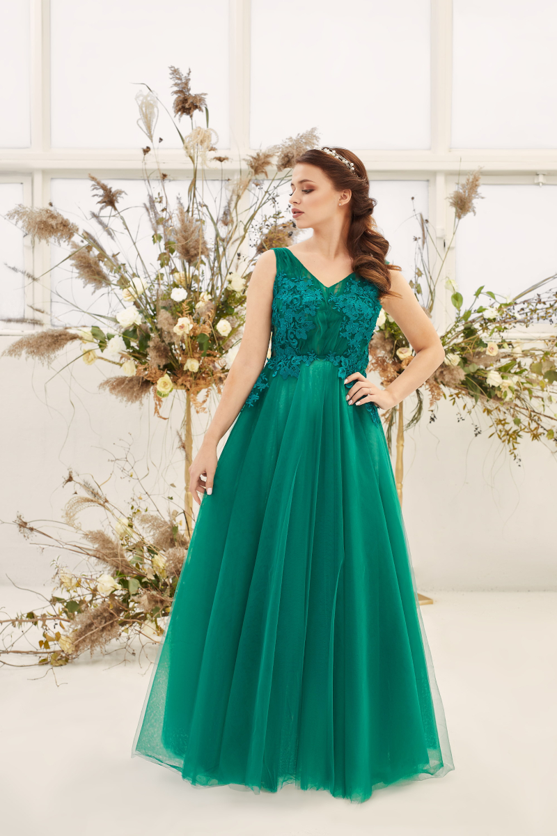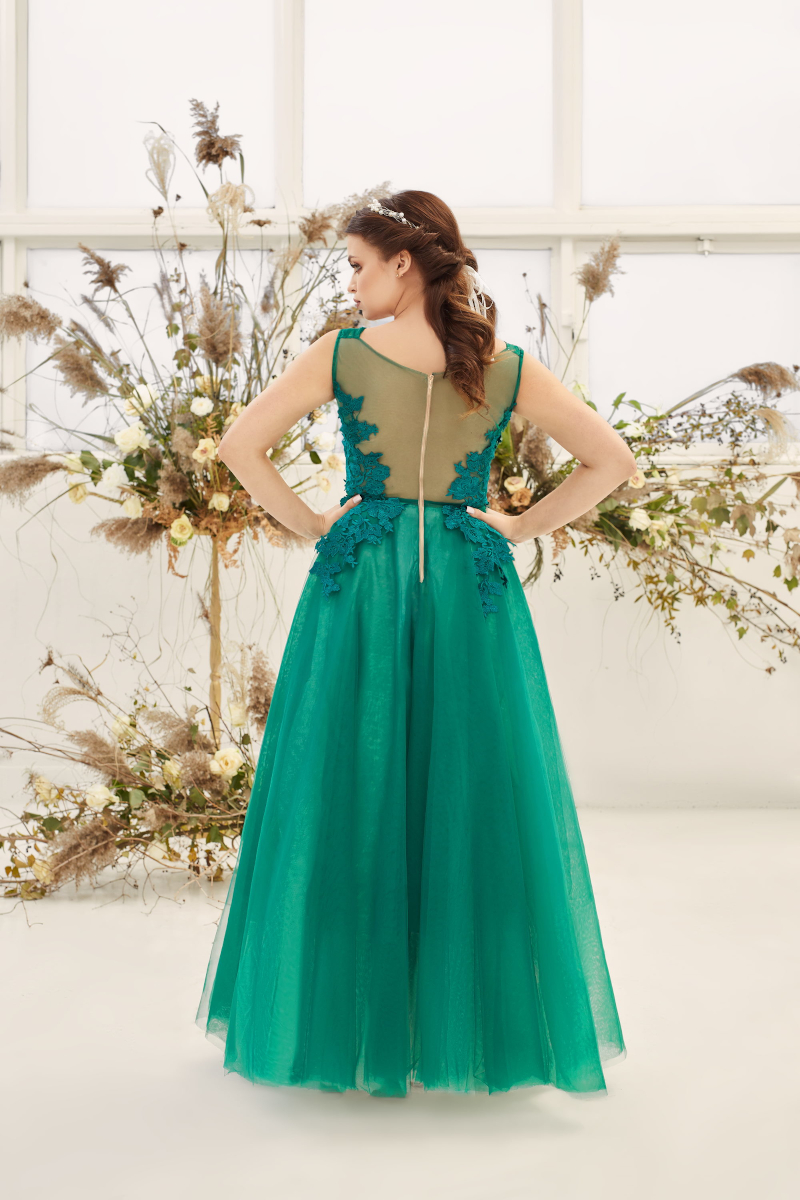 Tiulowa suknia w odcieniu butelkowej zieleni. Kolor w połączeniu z ręcznie naszytym motywem daje wrażenie oplatających talię liści. Przeźroczysty tył dodatkowo akcentuje koronkowy wzór.